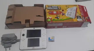 Consola Nintendo 2DS en color blanco, edición especial New Super Mario Bros. 2. Incluye la caja original y tarjetas. - Edición especial New Super Mario Bros. 2. - Incluye tarjeta de memoria de 4GB. - Incluye tarjetas de juego. - Caja original. - No incluye lápiz ni cargador. La consola tiene instalado el juego de súper Mario bros 2. creo que también tiene un juego de adiestramiento de perros. La consola esta sin batería, no puedo cargarla porque no encuentro el cargador, pero funciona perfectamente y esta bien cuidada.