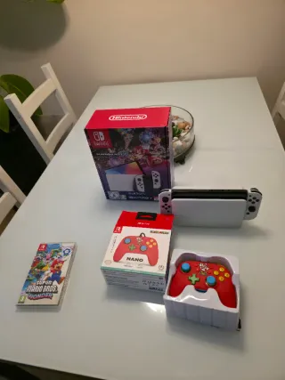 Consola Nintendo Switch blanca con pantalla Oled. Incluye un mando y el juego del super mario bros wonder. Viene con todos los accesorios originales de Nintendo.