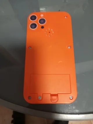 Consola de videojuegos portátil de color naranja con diseño inspirado en Tetris. - Pantalla LCD. - Botones de control. - Decoración con bloques de Tetris.