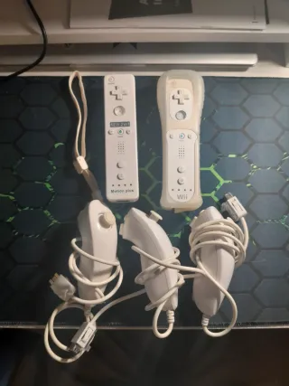 Pack de mandos para Nintendo Wii, incluye mandos y nunchuks. Todo en perfecto estado, no incluye pilas 🔋 - 2 Mandos Wii con correa. - 3 Nunchuks con cable.