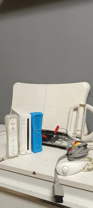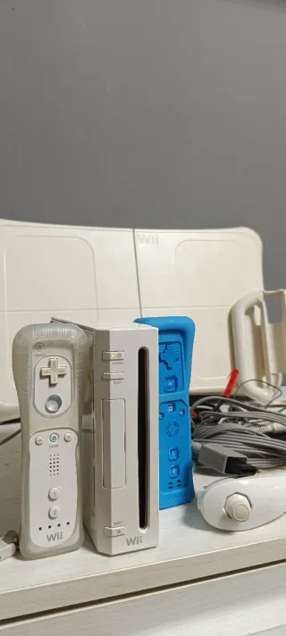 Consola Nintendo Wii en color blanco, con tabla Balance Board y varios juegos. - Incluye consola Wii. - Tabla Balance Board. - Juegos: Zumba Fitness 2, Just Dance, Wii Fit, Wii Play, Sing It. - Cables originales: Fuente de alimentación, cable AV (3 colores) y Barra Sensora. - Controles: 2 Mandos Wii Remote (con fundas de silicona) + 1 Nunchuk.