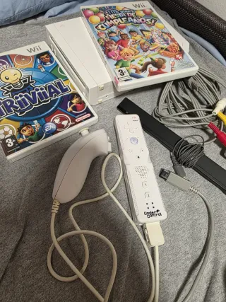 Consola Nintendo Wii en color blanco, lista para horas de diversión. Incluye dos juegos cables y mando - Juego: ¡Mi Gran Fiesta de Cumpleaños! - Juego: Wii Riivial - Mando Wii Remote - Nunchuk - Cableado de conexión venta en Barcelona