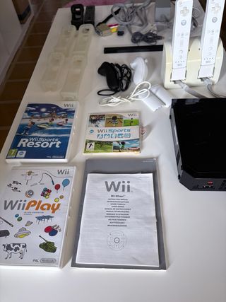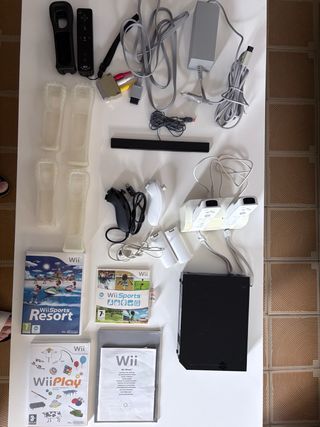 Consola Wii negra con varios accesorios para disfrutar. • Consola Nintendo Wii • 3 mandos Wii Remote • 2 nunchuk • Base de carga para mandos • Cables completos + sensor • Juegos (Wii Sports Resort, Wii Sports, Wii Play)