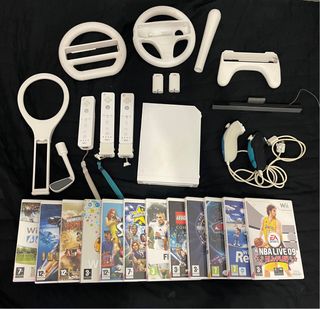 Consola Nintendo Wii en color blanco, En perfecto estado, ideal para disfrutar de tus juegos favoritos. - Incluye consola Wii. - 3 Mando Wii Remote y 2 Nunchuk. - Volante Wii Wheel. - Cables alimentación y señal. - Varios juegos incluidos: NBA Live 09, LEGO City, etc.