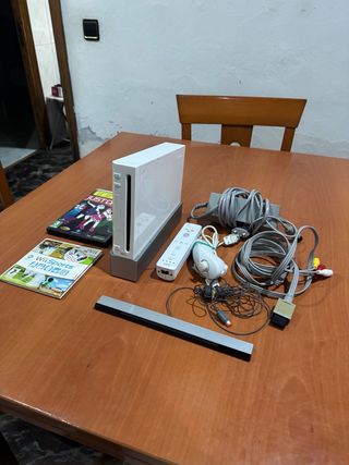 Consola Nintendo Wii en color blanco, lista para horas de diversión. - Incluye los juegos Just Dance y Wii Sports. - Incluye mando Wii Remote, Nunchuk y barra sensora. - Incluye cables de conexión y adaptador de corriente.