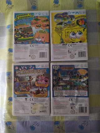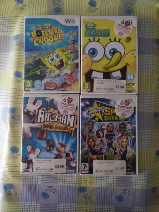 Lote de 4 juegos para Nintendo Wii. 6 euros cada uno si te llevan los cuatro los dejo a 20€. - Bob Esponja: Botes de Choque - Bob Esponja: atrapados en el congelador - Rayman: Raving Rabbids - Celebrity Sports Showdown Muy buen estado incluyen manual.