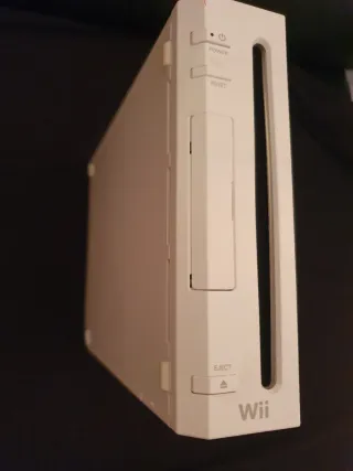 Consola Nintendo Wii en color blanco. Un clásico para horas de diversión. - Diseño vertical u horizontal. - Botones de encendido y reinicio accesibles. - Ranura para discos. - Botón de expulsión de disco Con 4 juegos
