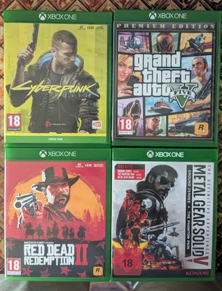 Pack con los juegos completos GTA 5 Premium Edition y Cyberpunk 2077. Se acompaña con las Cajas del Read Dead Redemption 2 y el Metal Gear Solid 5 Definitive Experience. Consola Xbox One
