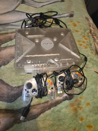 Consola Xbox clásica con dos controles transparentes. - Diseño icónico de la consola. - Controles con cable.