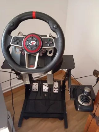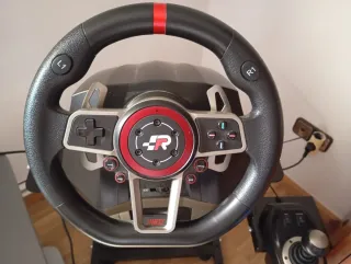 Volante de simulación compatible con consolas. - Diseño deportivo con detalles en rojo. - Botones L1 y R1 en el aro. - Palancas de cambio. - Base con pedales.