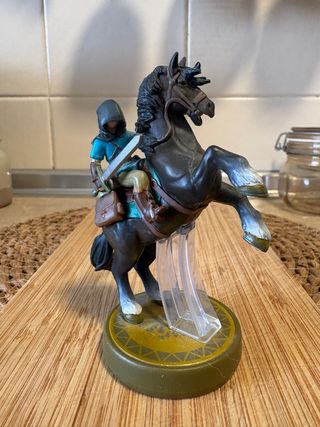 Figura Amiibo de Link jinete, de la colección The Legend of Zelda: Tears of the Kingdom. - Detallado diseño del personaje y su caballo. - Base temática del juego.