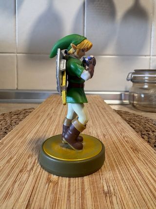 Figura Amiibo de Link, personaje icónico de The Legend of Zelda: Ocarina of Time. - Diseño detallado del personaje. - Base circular para exhibición.