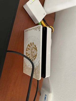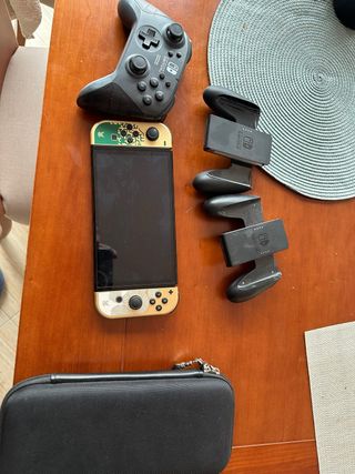 Consola Nintendo Switch modelo OLED con un diseño especial inspirado en Zelda. - Color dorado y multicolor. - Incluye mando adicional. - Estuche de transporte. -para conectar a tele -auriculares origianles