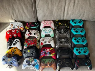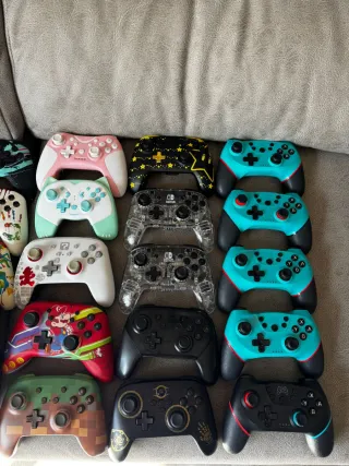 Pack de mandos para Nintendo Switch con diversos diseños. 18 mandos inalambricos 7 mandos con cable - Mando blanco con detalles rojos y amarillos. - Mando rojo con logo M. - Mando blanco y negro con logo Switch. - Mando amarillo con diseño de Pikachu. - Mando azul y morado con diseño de Zelda. - Mando negro con estrellas amarillas. - Mando blanco con salpicaduras de pintura. - Mando con diseño de tigre. - Mando blanco con detalles rojos. - Mando transparente. - Mando transparente. - Mando negro con estrella amarilla. - Mando con diseño de Mario. - Mando con diseño de Minecraft. - Mando negro con detalles rojos. - Mando azul con det
