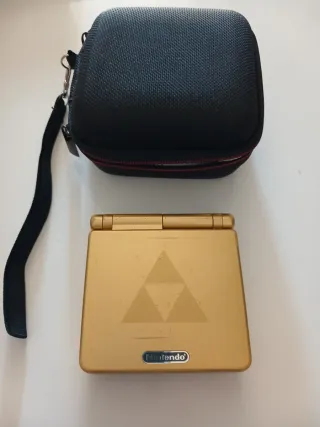 Consola portátil Game Boy Advance SP con un diseño especial inspirado en Zelda. Incluye una funda protectora...... Pantallas muy nuevas y funciona perfectamente - Color dorado con Trifuerza grabada. - Funda negra con correa.