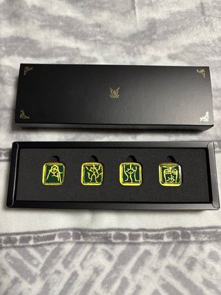 Set de 4 pines coleccionables de Zelda: Tears of the Kingdom. Cada pin tiene un diseño único con símbolos del juego. - Diseño cuadrado con borde dorado. - Fondo verde esmeralda. - Símbolos dorados grabados.