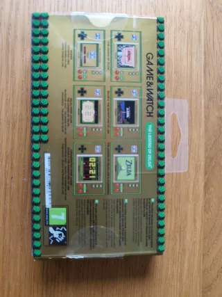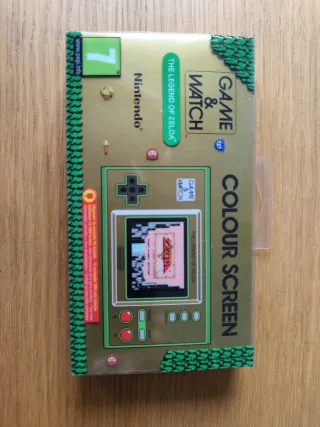 Consola portátil clásica Nintendo Game & Watch de 1989, modelo Zelda. - Diseño plegable en color verde y blanco. - Pantalla LCD con gráficos del juego. - Botones de control y ataque. - Incluye juego Water of Life.