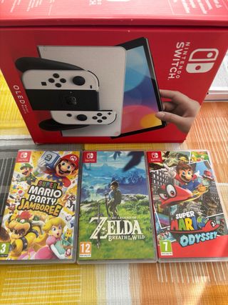 Nintendo Switch OLED + Zelda BOTW + Mario Odyssey + Mario Party Jamboree + funda y caja ------------------------------------------------ Precios individuales: Nintendo + Funda + caja + Protector de pantalla - 220€ ------------------------------------------------ Zelda BOTW - 45€ Odyssey -45€ Mario Party Jamboree- 45€