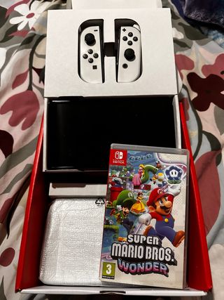 Consola Nintendo Switch en perfecto estado, lista para horas de diversión. Incluye el juego Super Mario Bros. Wonder. está nuevo solo un uso y se guardó otra vez en su caja. precio 270€,solo se entrega en mano, no se hace envíos - Joy-Cons blancos. - Pantalla negra. - Juego Super Mario Bros. Wonder.
