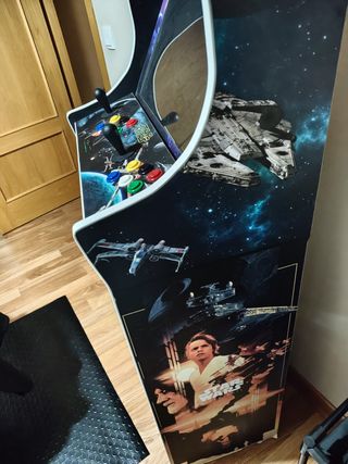 Máquina arcade recreativa de cuerpo completo, personalizada con vinilos de Star Wars en laterales, frontal y marquesina. Diseño tipo arcade clásico, ideal para uso doméstico, sala de juegos o espacio friki. - Panel de control con joysticks y botones. - Gráficos de alta calidad con temática espacial. - Ideal para los fans de Star Wars.