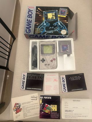 Consola portátil Nintendo Game Boy con su caja original de primera edición. -Caja y corcho en muy buenas condiciones - Consola Game Boy en perfecto estado - Juego Tetris en perfecto estado visual y funciona perfectamente - Caja original primera edición ERBE - Manuales de instrucciones consola y juego tetris ERBE - Tarjeta de garantía. -Fidelidad nintendo. -Poster -tarjeta Epilepsia
