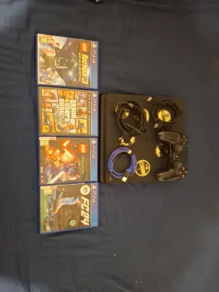 Consola PlayStation 4 Slim en color negro. - Incluye los siguientes juegos: - LEGO Batman 3: Más allá de Gotham - Grand Theft Auto V Premium Edition - LEGO Star Wars: El Despertar de la Fuerza - EA Sports FC 24 - Dos mandos DualShock 4. - Cables de conexión.