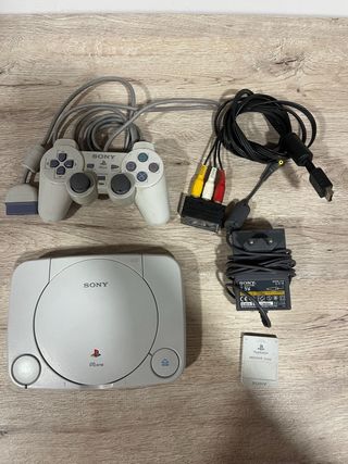 ❗️La consola enciende pero no se ha podido comprobar su total funcionamiento al no disponer de televisor compatible con el conector AV ni juegos. Consola clásica Sony PlayStation 1, modelo PSone, en color gris. Incluye todos los cables necesarios para su conexión y un mando. - Mando original Sony. - Cable AV con conexiones RCA (amarillo, blanco, rojo). - Adaptador de corriente. - Tarjeta de memoria PlayStation.