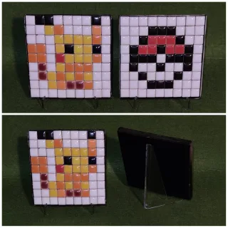 Cuadro decorativo de teselas inspirado en videojuegos, con un diseño pixelado y soporte para exhibición. Medidas: 9x9 cm. Precio por unidad 5€. ¡Dime cuáles prefieres! :) - Mosaico de cerámica artesanal, sobre cartón y trasera de terciopelo, con diseño de videojuego. - Incluye peana de metacrilato para colocarlo de pie. - Ideal para coleccionistas y amantes de los videojuegos retro. -Para una estantería o mesa de un estudio, sala o habitación. SÓLO HAGO ENVÍOS: correos particular o wallapop. NO entrego en mano, no Inpost, no GLS. Gracias!