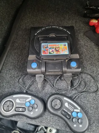 Consola de videojuegos clásica con dos mandos. - Incluye cartucho con múltiples juegos. - Diseño retro en color negro.