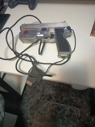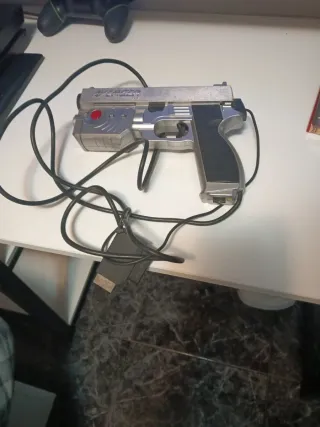 Pistola de videojuegos estilo retro. - Diseño plateado y negro. - Gatillo y detalles en rojo. - Cable de conexión incluido.