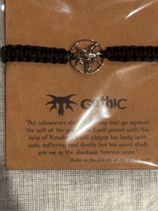 Pulsera con cordón negro y dije de pentagrama plateado, inspirada en el videojuego Gothic. - Diseño unisex. - Cierre ajustable. - Detalle de cita inspiradora en la tarjeta.