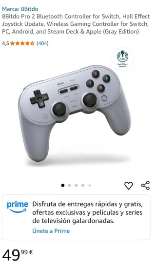 Control de videojuegos 8BitDo Pro 2 en color gris. - Joystick Hall Effect. - Botones X, Y, A, B. - D-pad. - Botones Start y Select.