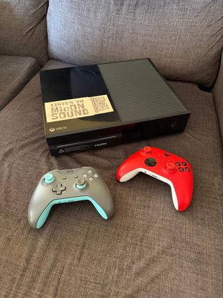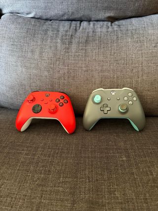 Dos mandos para Xbox One, uno en color rojo y otro en gris. - Mando color rojo. - Mando color gris.