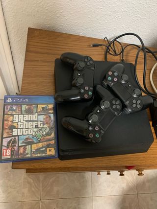 Consola PlayStation 4 en color negro, junto con el popular videojuego Grand Theft Auto V.todo funciona correctamente y se incluyen los tres mandos y cables de la play esta como nueva tengo su caja - Incluye consola. - Incluye juego Grand Theft Auto V.