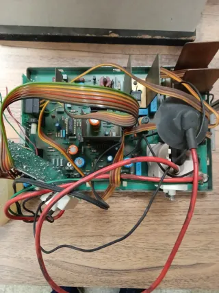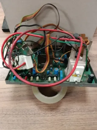 Placa de circuito electrónico con varios componentes y cables conectados.funciona perfectamente - Componentes electrónicos visibles. - Múltiples cables de conexión de colores.