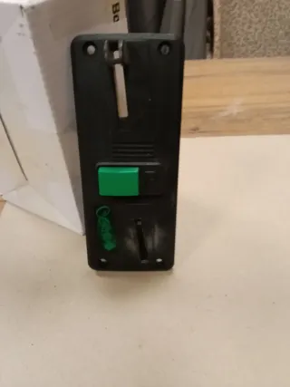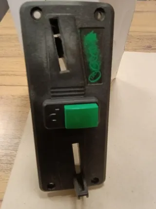 Soporte para monedero de la marca Jofemar. Pieza de plástico negro con ranura para monedas y botón. - Ranura superior para la inserción de monedas. - Botón de color verde. - Ranura inferior para la salida de las monedas o cambio. - Diseño rectangular con orificios para montaje.