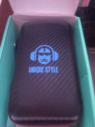 Consola de videojuegos portátil con pantalla de 4 pulgadas. Diseño moderno y compacto. - Acabado exterior con textura de fibra de carbono. - Detalle frontal con logo Unique Style y auriculares. - Color principal negro con detalles en azul.