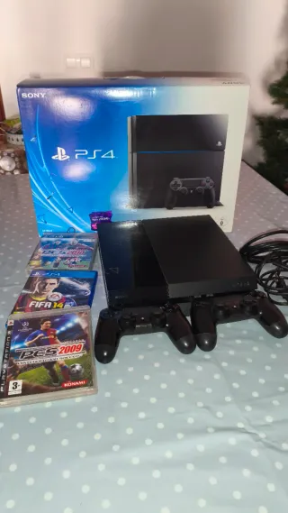 Consola PlayStation 4 en color negro, lista para disfrutar. - Incluye dos mandos DualShock 4.(A 1 le faltan 3 gatillos, pero funciona perfectamente) - Juegos: FIFA 14, PES 2010, PES 2009. - Cables de conexión incluidos.