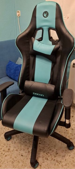 Silla de estilo gaming en color negro y azul, con un diseño ergonómico. - Diseño deportivo. - Acolchado para mayor comodidad. - Incluye cojines para cabeza y lumbar.