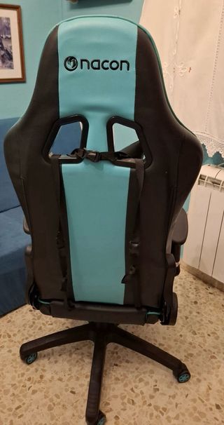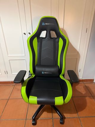 Silla de gaming con un diseño ergonómico y llamativo. - Tapicería en polipiel negra con detalles en verde lima. - Respaldo alto con soporte lumbar. - Reposabrazos acolchados. - Base con ruedas para fácil movilidad.