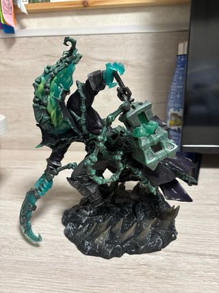 Figura coleccionable del personaje Thresh de League of Legends. Representa al Carcelero Implacable con su guadaña y cadenas. - Diseño detallado. - Colores verde y negro predominantes. - Base rocosa con pinchos.
