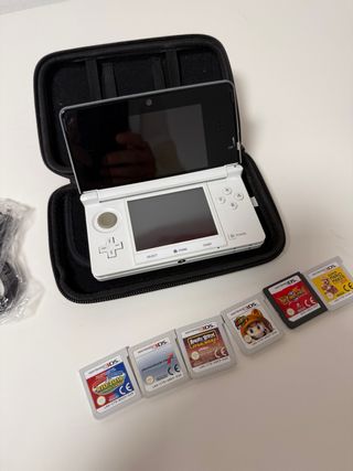 Consola Nintendo 3DS en color blanco, con funda protectora y seis juegos. - Juegos incluidos: - Rio 2016 Olympic Games - Mario & Sonic at the Olympic Games - Angry Birds Star Wars - Mario Kart 7 - Super Mario Maker - Yoshi's New Island