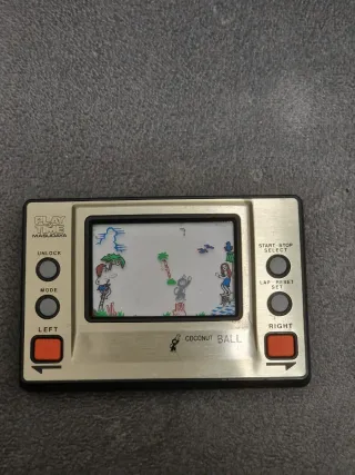Juego electrónico portátil Masudaya Coconut Ball en color dorado. Un clásico para coleccionistas y amantes de los videojuegos retro, funciona perfectamente. - Diseño compacto y ligero. - Botones de control para la experiencia de juego.