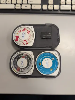 Se venden 2 juegos de PSP: Los Sims 2 Mascotas y Toca Race Driver 3 con estuche para guardar y transportar juegos UMD de PSP y tarjetas de memoria, se incluye un disco DEMO Marvel de regalo. Tambie se incluye una tarjeta M2 de 1gb