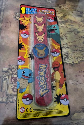 Pulsera tipo slap band con diseño de Pokémon. Ideal para coleccionar o usar. - Personaje principal: Pikachu. - Diseño con varios Pikachu y Pokébolas. - Incluye un medallón central con Pikachu. - Licencia oficial Pokémon.