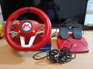Volante y pedales para Nintendo Switch, con diseño inspirado en Mario Kart. - Volante rojo con detalles azules y el logo de Mario. - Incluye dos pedales. - Conexión por cable.