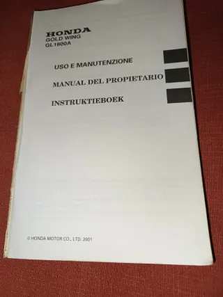 Manual de uso y mantenimiento para la Honda Gold Wing GL1800A. Año 2001 Sin tapas y en estrangero. - Título en italiano: Uso e Manutenzione - Título en neerlandés: Instruktieboek - Publicado por Honda Motor Co., Ltd. en 2001.
