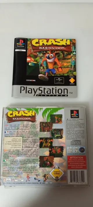 Manual y trasera del juego Crash Bandicoot para PlayStation 1. -sin el disco y sin la caja solo libro en varios idiomas y hoja trasera - Texto en español.