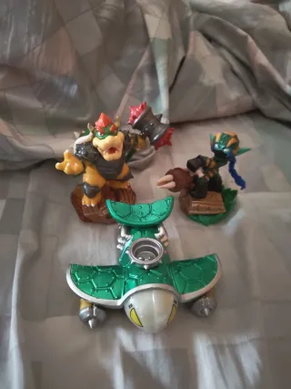 Lote de figuras de Skylanders que incluye a Bowser, Stealth Elf y un vehículo. - Figura de Bowser. - Figura de Stealth Elf. - Vehículo verde con detalles plateados. Compatible con Switch