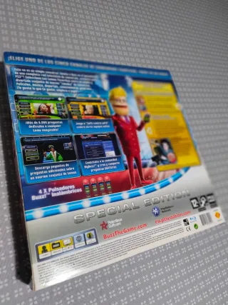 Juego de preguntas y respuestas para PlayStation 3. - Edición especial. - Formato físico. - Caja grande con algunos roces y una pequeña rotura reparada con cinta adhesiva. - Caja interior en perfecto estado. - Juego en su caja original con sus manuales. - Mandos Buzz en perfecto estado. - Conserva las pilas originales Sony sin sulfata.